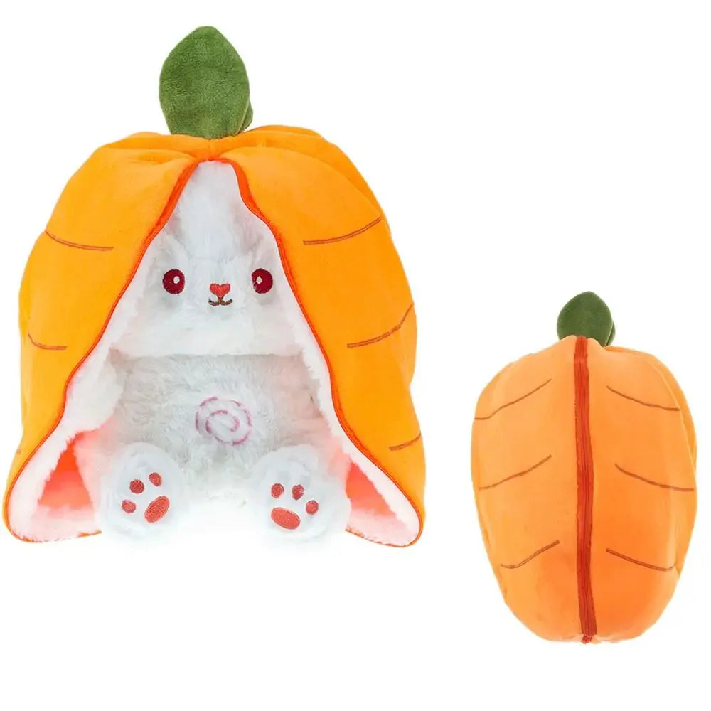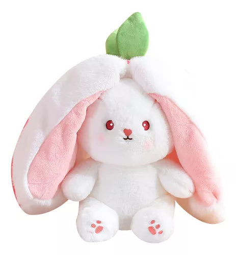 este peluche tiene presentación en forma de zanahoria ,cuenta con cierre y al momento de abrirlo se convierte en un lindo conejito con unas super orejas .